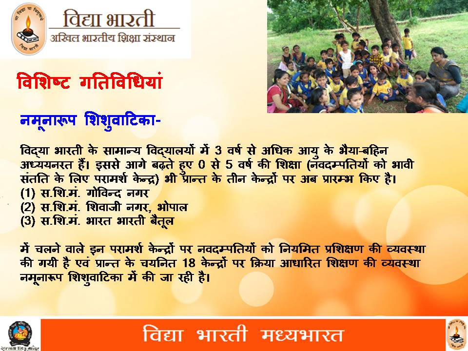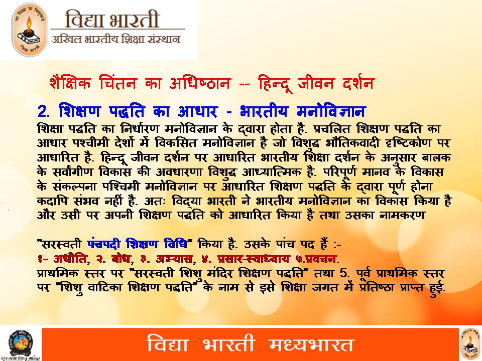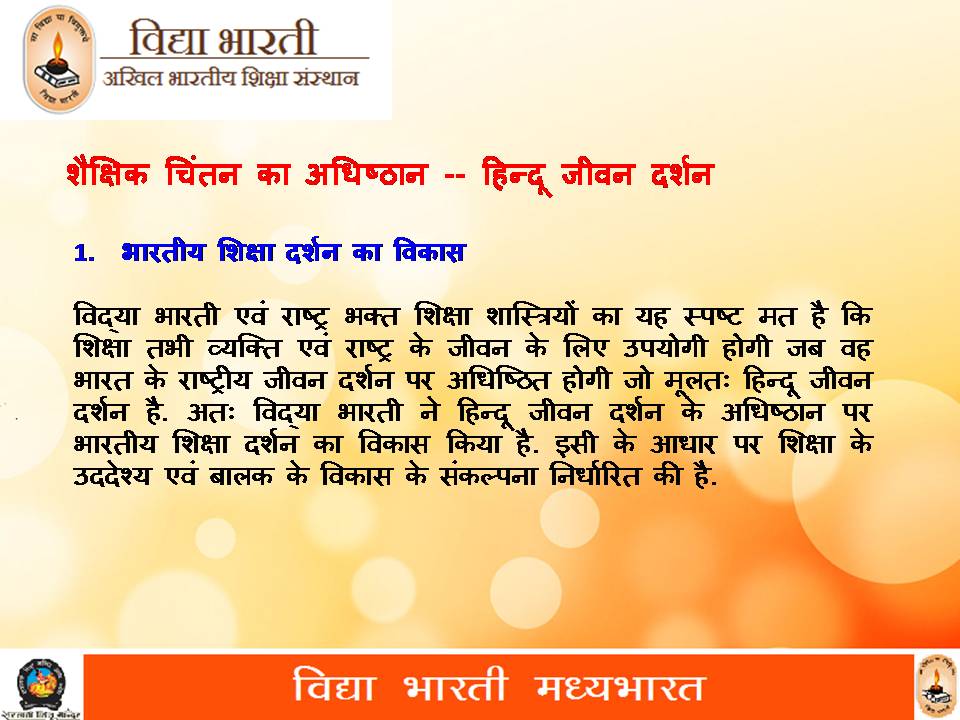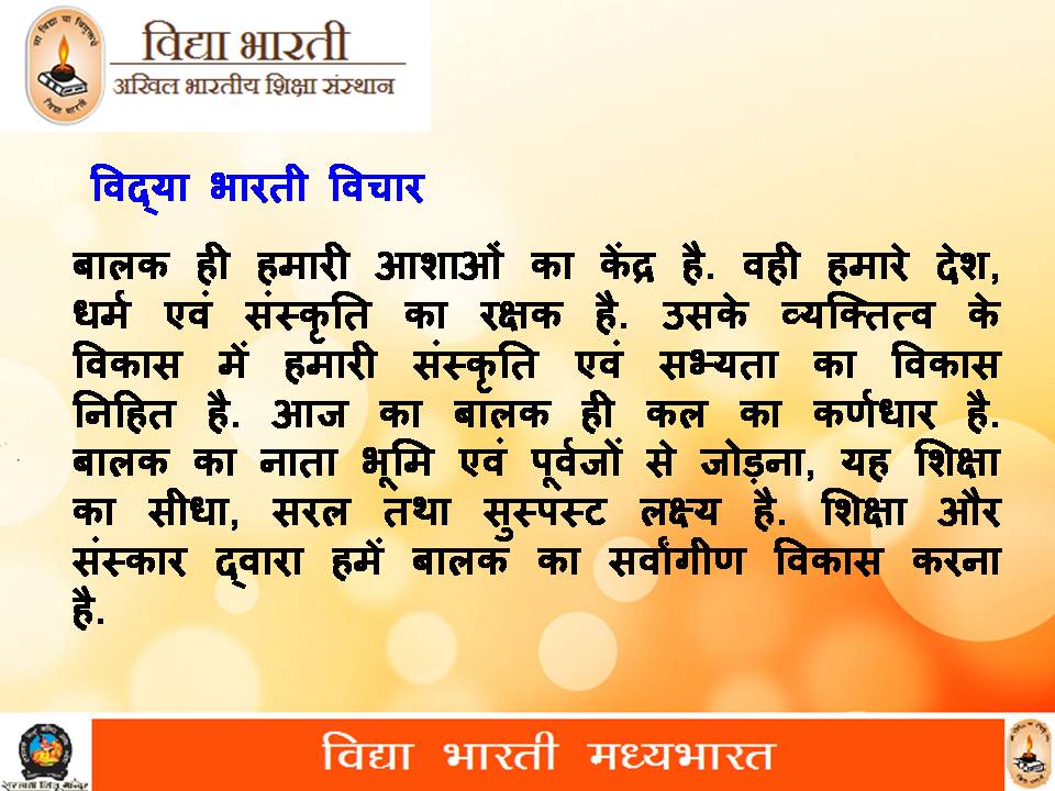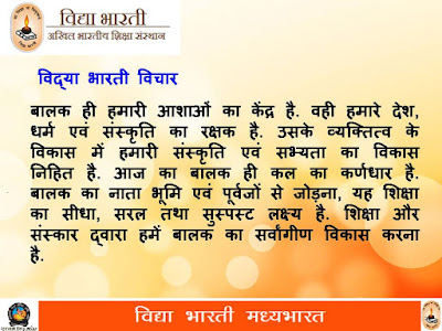 विद्या भारती बालक ही हमारी आशाओं का केंद्र है. वही हमारे देश, धर्म एवं संस्कृति का रक्षक है. उसके व्यक्तित्व के विकास में हमारी संस्कृति एवं सभ्यता का विकास निहित है. आज का बालक ही कल का कर्णधार है. बालक का नाता भूमि एवं पूर्वजों से जोड़ना, यह शिक्षा का सीधा, सरल तथा सुस्पस्ट लक्ष्य है. शिक्षा और संस्कार द्वारा हमें बालक का सर्वांगीण विकास करना है.