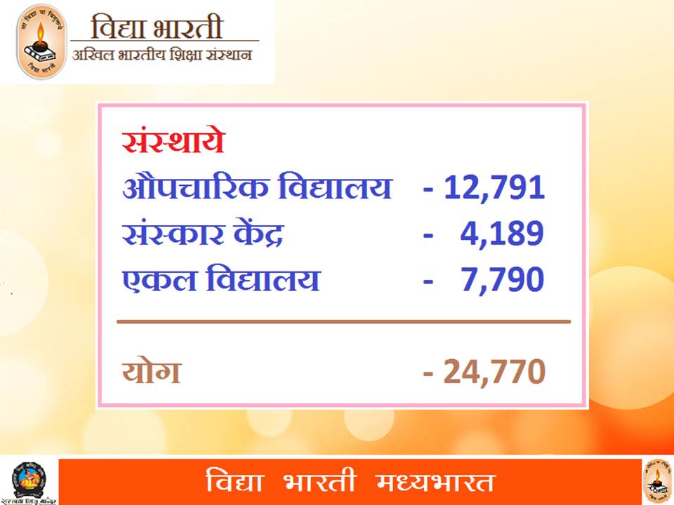 आज लक्षद्वीप और मिजोरम को छोड़कर सम्पूर्ण भारत में 86 प्रांतीय एवं क्षेत्रीय समितियां विद्या भारती से संलग्न हैं. इनके अंतर्गत कुल मिलाकर 23320 शिक्षण संस्थाओं में 1,47,634 शिक्षकों के मार्गदर्शन में 34 लाख छात्र-छात्राएं शिक्षा एवं संस्कार ग्रहण कर रहे हैं. इनमें से 49 शिक्षक प्रशिक्षक संस्थान एवं महाविद्यालय, 2353 माध्यमिक एवं 923 उच्चतर माध्यमिक विद्यालय, 633 पूर्व प्राथमिक एवं 5312 प्राथमिक, 4164 उच्च प्राथमिक एवं 6127 एकल शिक्षक विद्यालय तथा 3679 संस्कार केंद्र हैं. आज नगरों और ग्रामों में, वनवासी और पर्वतीय क्षेत्रों में झुग्गी-झोंपड़ियों में, शिशु वाटिकाएं, शिशु मंदिर, विद्या मंदिर, सरस्वती विद्यालय, उच्चतर शिक्षा संस्थान, शिक्षक प्रशिक्षण केंद्र और शोध संस्थान हैं. इन सरस्वती मंदिरों की संख्या निरंतर बढ़ रही है. इसके फलस्वरूप अभिभावकों के साथ तथा हिन्दू समाज में निरंतर संपर्क बढ़ रहा है. हिन्दू समाज के हर क्षेत्र में प्रभाव बढ़ा है. आज विद्या भारती भारत में सबसे बड़ा गैर सरकारी शिक्षा संगठन बन गया है.