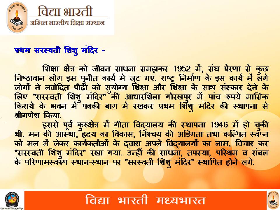 प्रथम सरस्वती शिशु मंदिर - बस यही स्वप्न लेकर इस शिक्षा क्षेत्र को जीवन साधना समझकर 1952 में, संघ प्रेरणा से कुछ निष्ठावान लोग इस पुनीत कार्य में जुट गए. राष्ट्र निर्माण के इस कार्य में लगे लोगों ने नवोदित पीढ़ी को सुयोग्य शिक्षा और शिक्षा के साथ संस्कार देने के लिए "सरस्वती शिशु मंदिर" की आधारशिला गोरखपुर में पांच रुपये मासिक किराये के भवन में पक्की बाग़ में रखकर प्रथम शिशु मंदिर की स्थापना से श्रीगणेश किया. इससे पूर्व कुरुक्षेत्र में गीता विद्यालय की स्थापना 1946 में हो चुकी थी. मन की आस्था, ह्रदय का विकास, निश्चय की अडिगता तथा कल्पित स्वप्न को मन में लेकर कार्यकर्ताओं के द्वारा अपने विद्यालयों का नाम, विचार कर "सरस्वती शिशु मंदिर" रखा गया. उन्हीं की साधना, तपस्या, परिश्रम व संबल के परिणामस्वरुप स्थान-स्थान पर "सरस्वती शिशु मंदिर" स्थापित होने लगे.